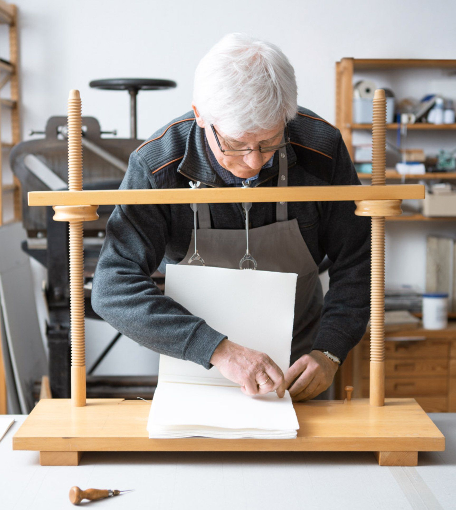 Außer der individuellen Prägung bietet Björn Hartl auch den Farbschnitt an: eine besondere Veredelungsmöglichkeit, bei der zwei Lagen Papier einen andersfarbigen Kern umschließen. So entsteht eine